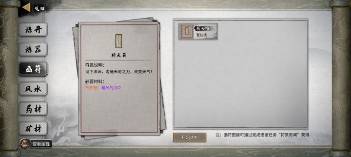 制作所需材料以及产出地和产量:2个精风竹(精风竹只能在“永宁州”内的“灵蕴竹林”通关有概率获得)备注:上品精风竹不能作为制作“祈天符”的材料
