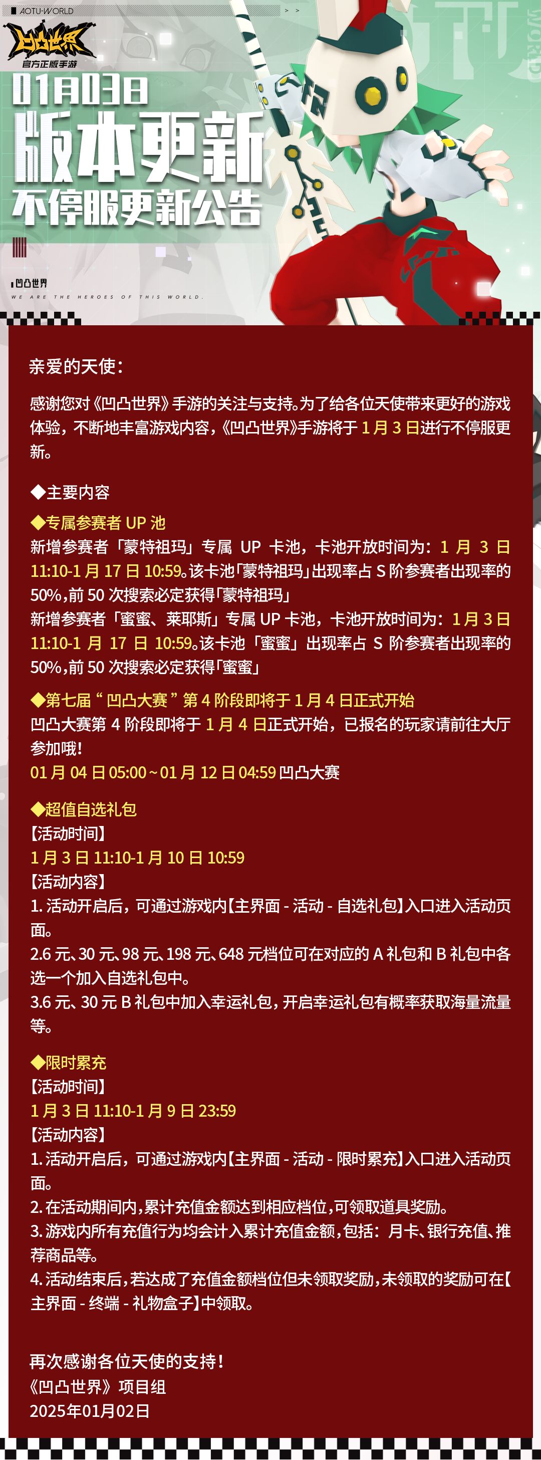 《凹凸世界》手游将于1月3日进行版本不停服更新。