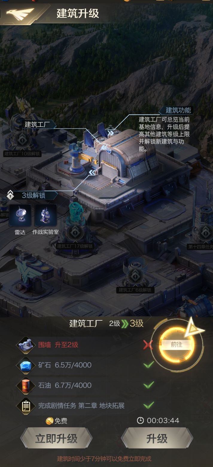 在前期刚开服阶段直接按照升级建筑工厂需要的前置建筑进行升级建造即可,专服的大量活动能够返还需要的资源与加速,帮助指挥官快速提升建筑等级。再升级建筑工厂的过程中,游戏内都会有详细的升级提示,大家根据提示操作即可,如下图所示: