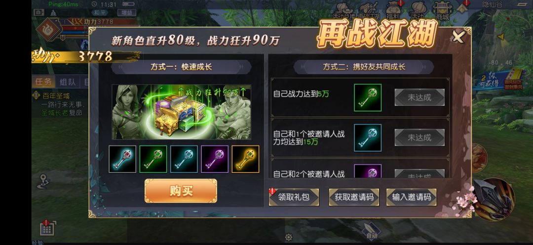 再战江湖是九阴3D手游中对目前新手或者新号来说帮助最便捷的一个玩法,它可以让你等级直接升到80级,节省了很多练级的时间,那么具体怎么使用呢,下面请听我细细道来。首先进去游戏之后,点游戏界面右上角活动那的再战江湖,进去之后点领取礼包,接着去自己背包里面找到那个礼包一打开,你就会立马升到80级传送到苏州安全区,然后你会发现包里有一些其他礼包和一个礼包2,以及四把钥匙,再战江湖可以开出6个礼包,每个礼包里面都有很多新手玩家所需要的不同材料道具,但是打开礼包2的翡翠钥匙没有,不要担心,这是设置问题,这把钥匙需要玩家自己战力升到5万就可以在活动页面领取了,那么怎么升到5万战力呢,首先把背包里面的所有能打开的礼包打开,这时会给你一本门派一内和50张门派二内残卷,都使用并且装备到内功里面,再打开右上角福利,找到里面的等级奖励,把到80级的福利全部领取,里面有一些道具可以使用,九幽令,七玄令,去对应的禁地里面使用,会得到几个侠客和一些侠客技能书,把这几个侠客装备好,把侠客技能书打在侠客身上,然后把侠客的资质洗一下,再点满就差不多到5万战力了,这个时候你就可以领取第二把翡翠钥匙了,剩下的就是挨个把礼包打开,把送的材料使用就行了