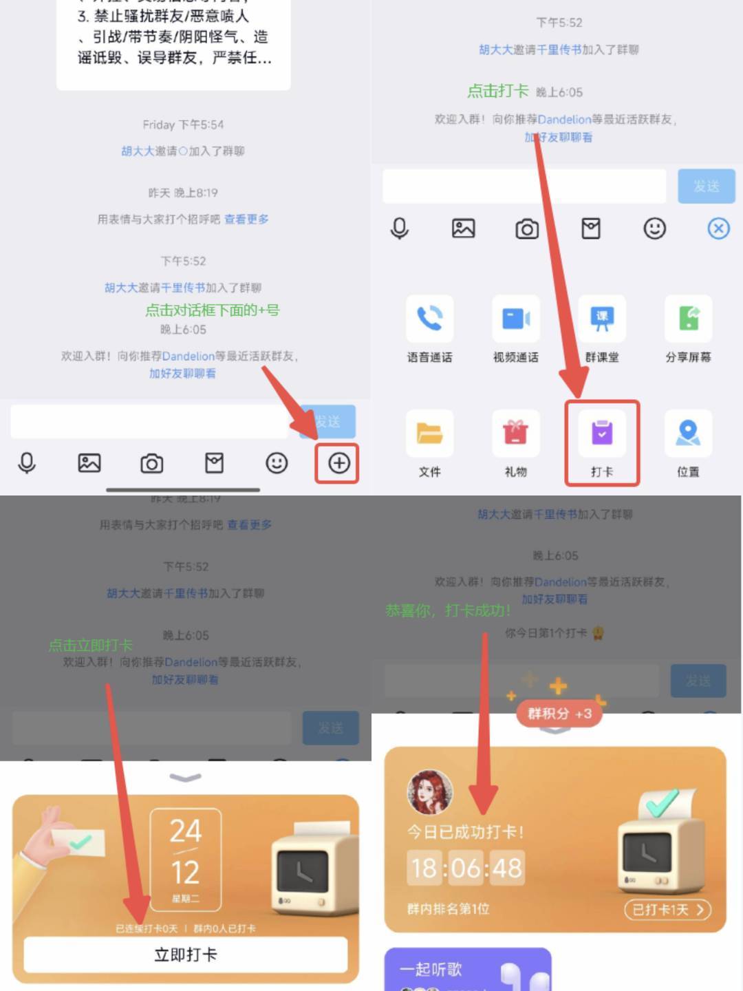 如何参与活动:手机QQ点击对话框的+号,即可看到打卡标签。点击打卡标签,出现立即打卡按钮,点击即可。