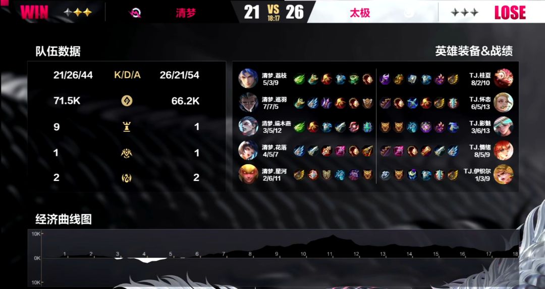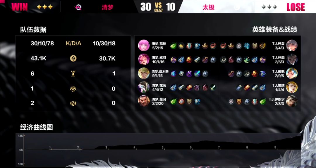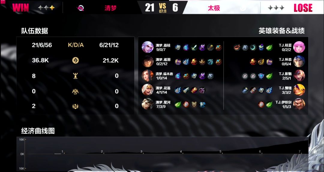 通过了前两天的比赛,队伍之间的实力差距逐渐显现,清梦作为目前B组积分榜排名第二的战队与第一名天不生的差距并不大。在面对太极的时候,他们在第一局当中就展现出了他们碾压的实力,星河的墨翟在开局就拿到了太极6个击杀,可谓天胡开局——仅7分就迅速推掉了太极的水晶,给了太极一个下马威。但太极也很快重整旗鼓,在第二局的时候给清梦造成了很大的阻力,不仅在前期就拿到优势,即便是在被清梦反超之后,也在将近15分钟的时间里,没能让对手将优势扩大。然而在18分钟双方在凛冬支配者的关键团战当中,龙居然被端木燕的班抢下,太极输龙输人,再无力抵抗,甚至在第三局当中也受到影响,状态低迷,被清梦3:0拿下,遗憾退场。