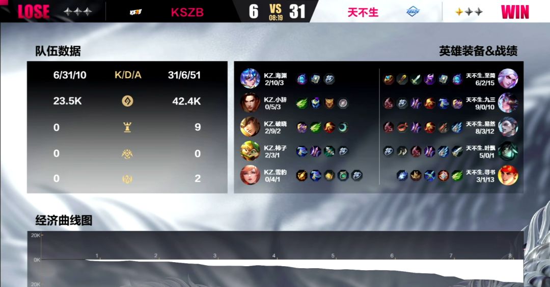 经历了昨日与清梦对战险胜的天不生,今天状态极佳。在面对本就与他们有实力差距,积分榜排名第四的KSZB战队,他们在三局当中几乎都是单方面碾压对手的。在三局当中,基本每一局都能在5分钟就积累出10k左右的压倒性经济优势,并且他们结束比赛的能力非常强,三局分别在8分钟、10分钟和7分钟的时间节点上就结束了比赛,虽然在第二局当中,KSZB战队在前期取得了一部分优势,在前3分钟的时间里甚至还一度经济压制了天不生战队。但天不生战队本就是一个韧性很强的战队,他们在面对强队的时候都经常逆风翻盘,更何况是面对初来乍到的KSZB。最终3:0兵不血刃,以B组第一的成绩,稳定晋级。