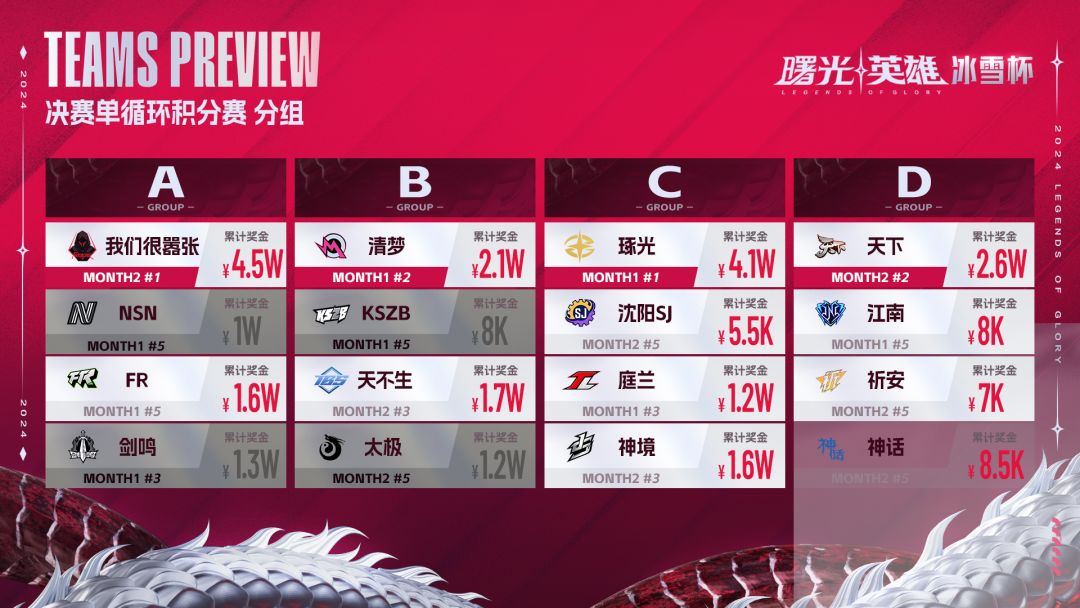 ②第一轮抽签战队池为两期月赛冠亚战队,共计4支战队,分别进入A/B/C/D组;