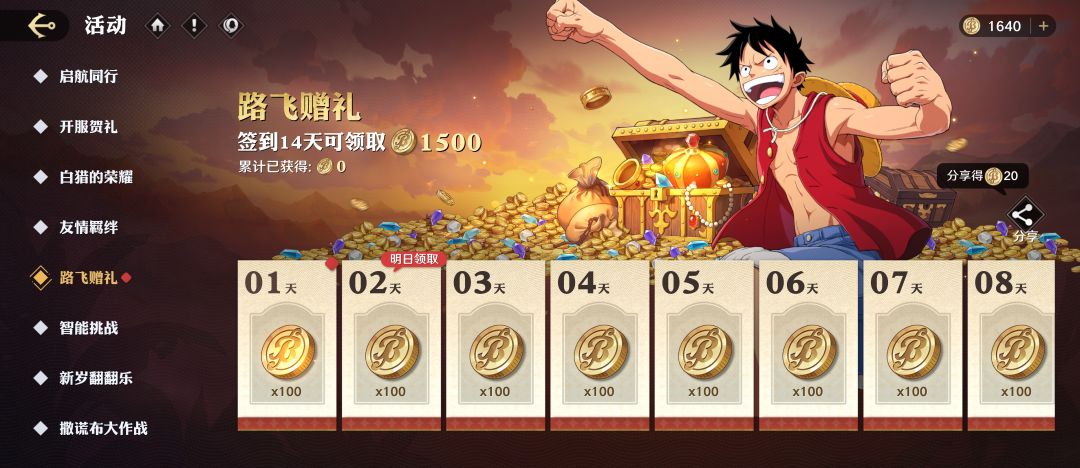 活动内容:路飞的赠礼活动开启,每日登录即可领取金币奖励,总计可领取金币*1500。