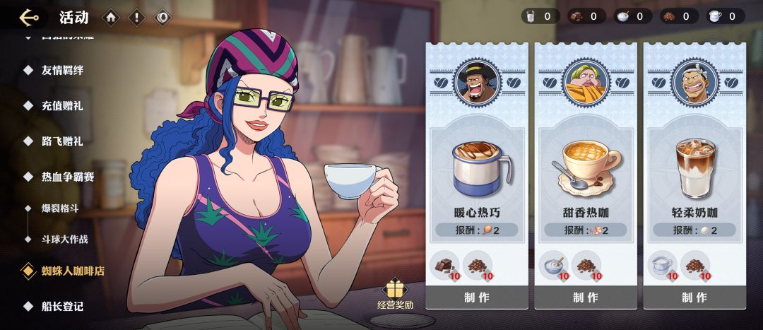 活动内容:领取每日任务宝箱奖励、消耗体力可获得咖啡原材料,使用原材料制作顾客需要的各种咖啡,即可获得不同报酬,为Mr.1或Mr.2制作咖啡后,可获得更加丰厚的报酬。完成经营目标要求,可领取额外奖励。