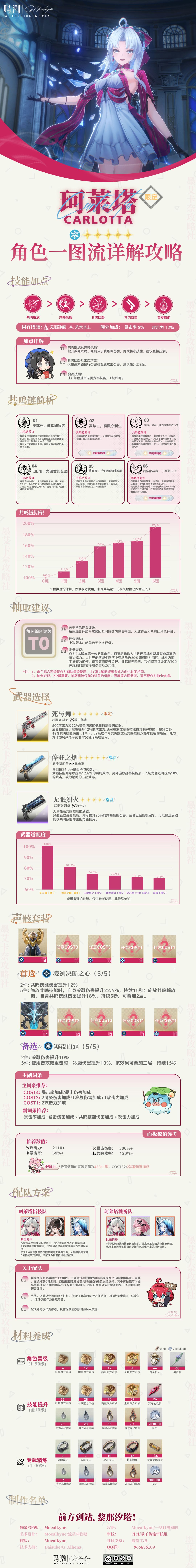 从2.0版本开始,我们将采用全新的模板制作角色一图流攻略!攻略组的同学们将会按照卡池顺序,逐步更新先前全部角色攻略,常驻五星和漂泊者的相关攻略将会不定时更新。全新的黎那汐塔模板修正了先前模板的部分重大Bug,