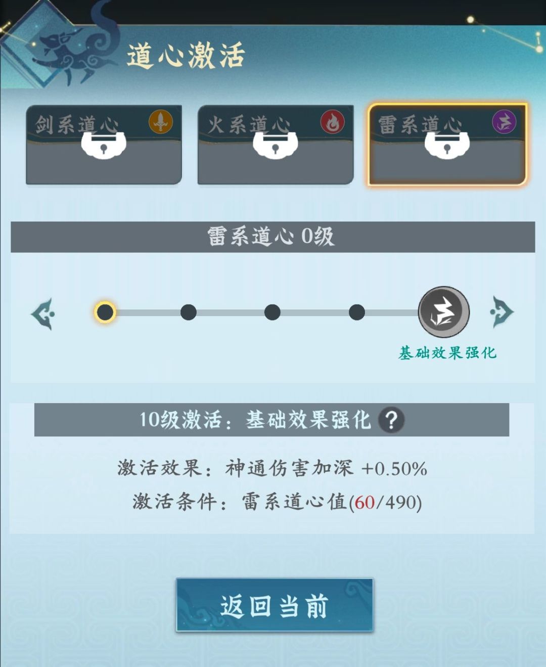 道心等级的提升(p4):需要获取该流派的神通,获取途径包括观星崖、宗门宝库、遗迹宝库、诸天商会、论剑商店等。道心等级影响法体的激活,进而影响伤害的增减倍率