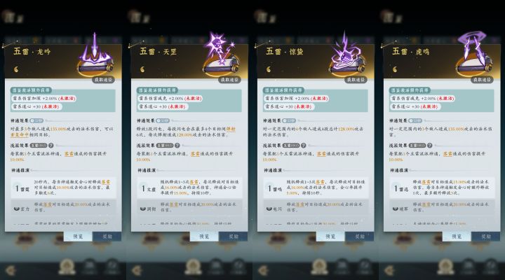 推荐神通搭配为“五雷龙吟”作为核心(p1),搭配“五雷天罡”、“五雷惊蛰”、“五雷虎鸣”。装备任意两枚五雷神通即可激活流派效果,每装备一枚五雷神通,落雷伤害提升10%