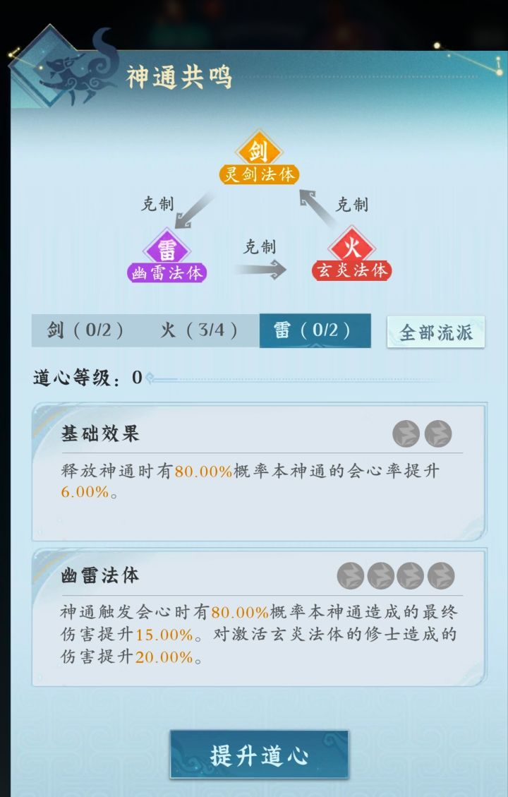 装备两个雷属性技能可解锁基础增益,集齐四个雷属性技能将激活幽雷法体,增强技能的最终伤害,并克制玄炎法体,额外造成20%的伤害增幅,说到属性克制(p3),就不得不提一下,问剑这款游戏并不是百分之百氪出强大,技能的搭配与法体的选择也至关重要,百分之20的伤害增幅足以弥补不小的战力差距,还望各位修士灵活变通。