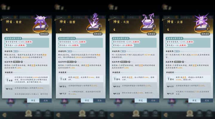 神霄流派的神通配置以“神霄·青索”为核心(p2),搭配“神霄·驱雷”、“神霄·云箓”、“神霄·天鼓”。着重于提升自身的会心倍率和会心概率,对敌人施加猛烈的物理打击,在刷副本时会有更加亮眼的表现。