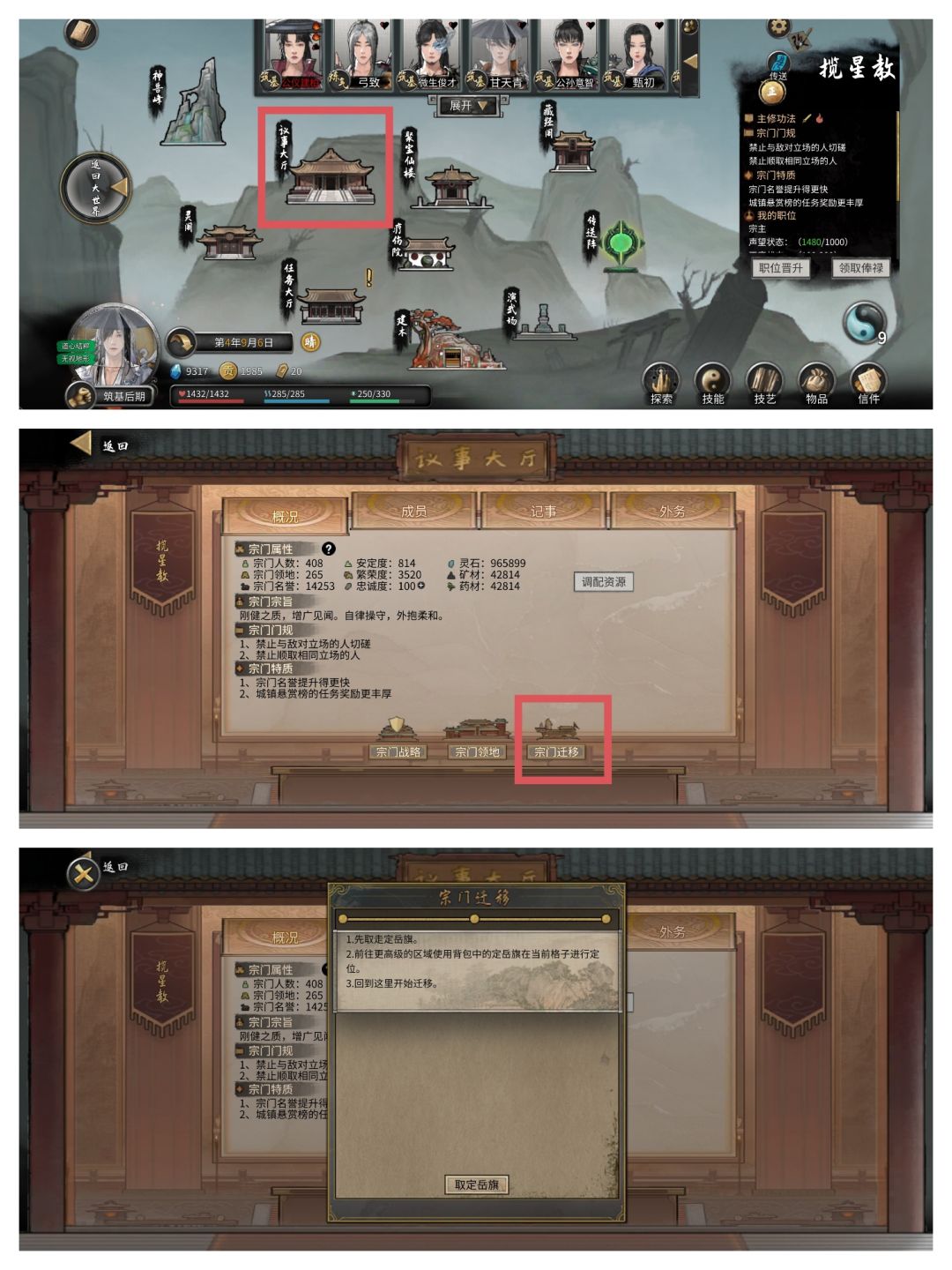 然后我们返回永宁州的宗门议事大厅,点击开始迁移,即可自动迁移过去。