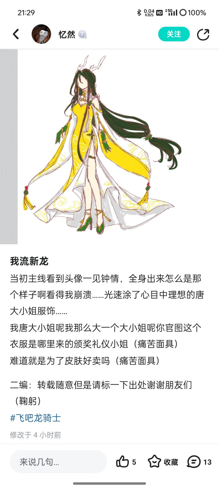 还有些小细节其实就能看出来官方是用了心的,龙形态红眼黄身偏凶也是全新的画风;人形态无袖手套不过手肘没问题,要是改一点点颜色凸出更明显更不错。对于服装,我也是看到了亿然大大画的感觉也很不错,毕竟之前的三敖都是贴身衣,那唐婉画一个新的也很好,毕竟这身旗袍看起来真的很像迎宾的。