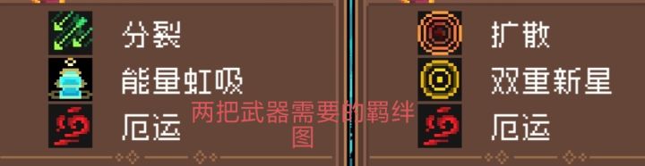 然后就是武器装备羁绊的养成,(会涉及到芯片,后面讲解)需要洗两把,分裂_能量虹吸_厄运(激光流派,刷图用),扩散_双重新星_厄运(陨石流派,爬塔用)最后一个厄运这样只需要一个七级芯片就可以两把通用。剩下的五个羁绊疾风骤雨(激光选择疾风骤雨,陨石选择风暴聚集)_元素亲和_引力新星_元素核心_生命吸取洗在装备上面这样就可以了。