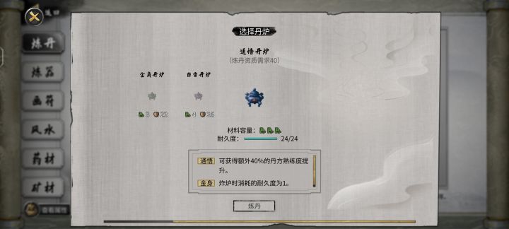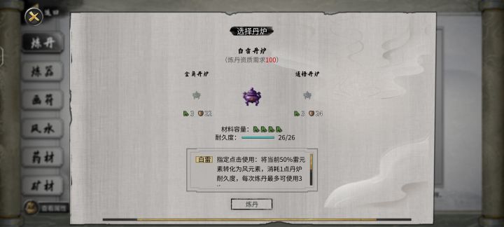 是这样的材料都刷好了,差一个化灵丹。买了两个丹炉。蓝色的那个只能出5品的化灵丹,紫色那个差资质。