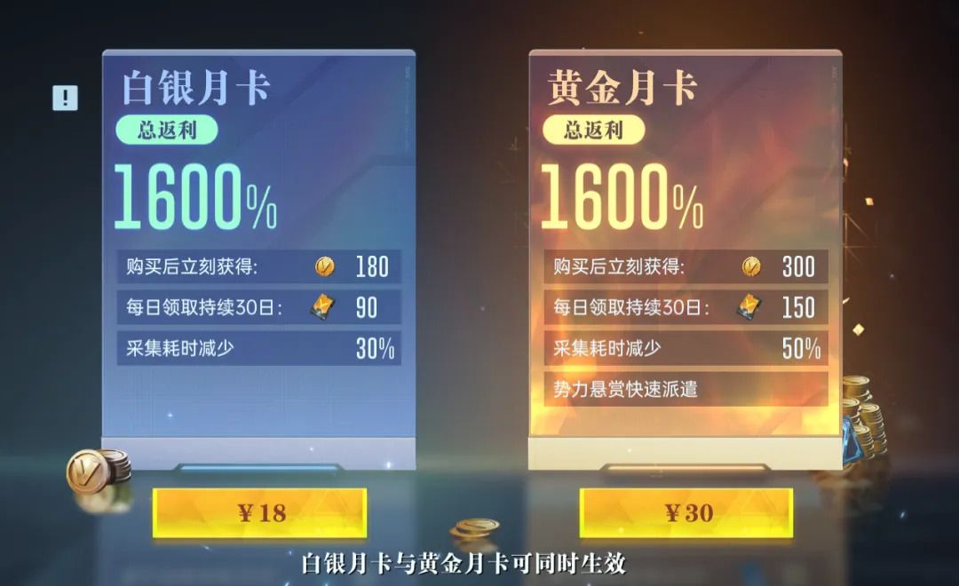 大小月卡的最大作用是减少采集消耗时间和激活势力悬赏的一键派遣功能,这两个功能会极大地提升游戏体验。大小月卡一起购买会减少80%的采集耗时,如果不购买每次采集会花费5分钟左右,购买之后1分钟就结束。