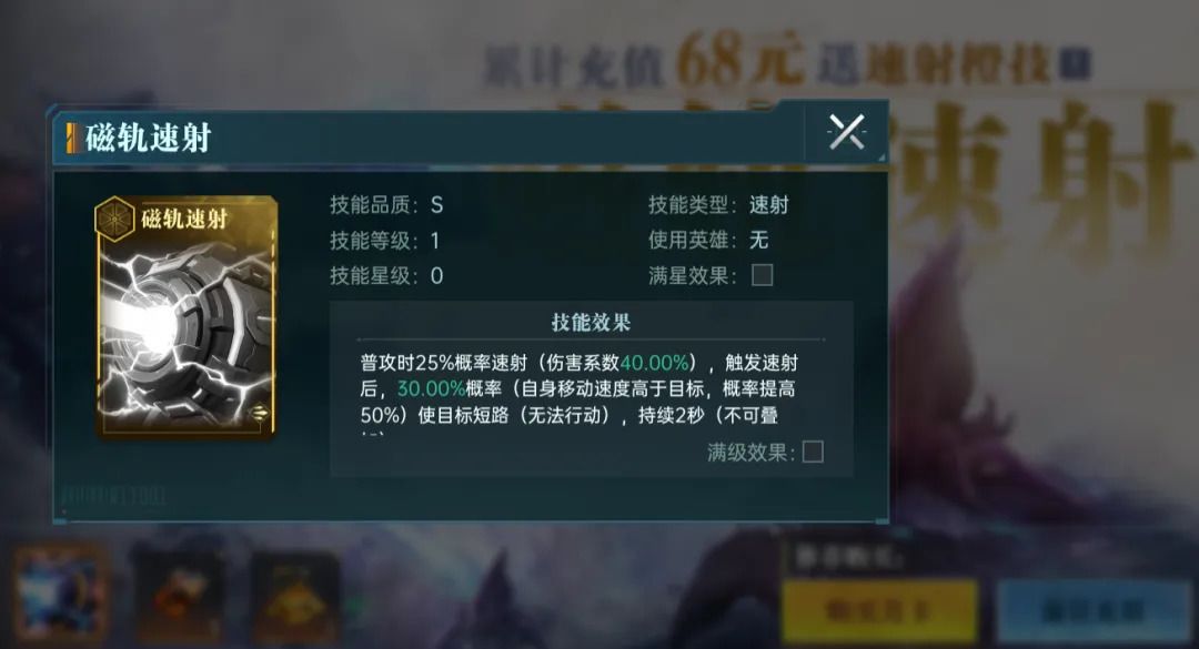 同时,购买大小月卡+通行证,可以激活满足68元的累充活动条件,领取一张S级速射技能卡-磁轨速射,可以硬控敌方,搭配前面提到的恒娥+安德洛美达速射队,可以很轻松渡过开荒期。