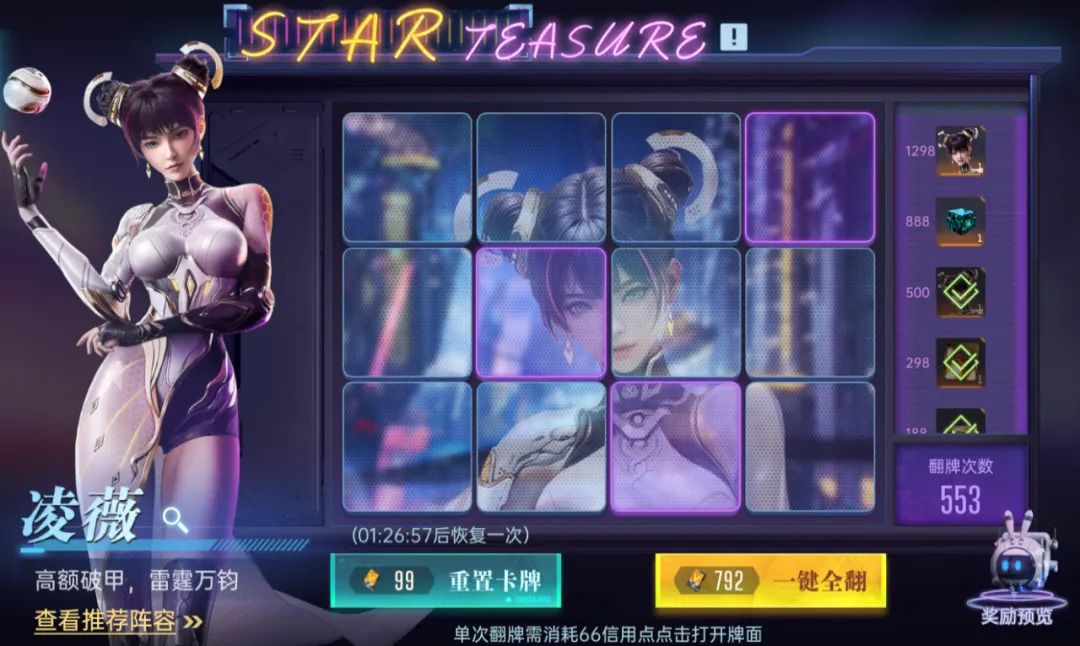 每次翻牌需要花费66信用点,500次则需要33000信用点,换算下来大概4个648,也就是2592元。同时,这个活动也有几率直接翻出“凌薇”。