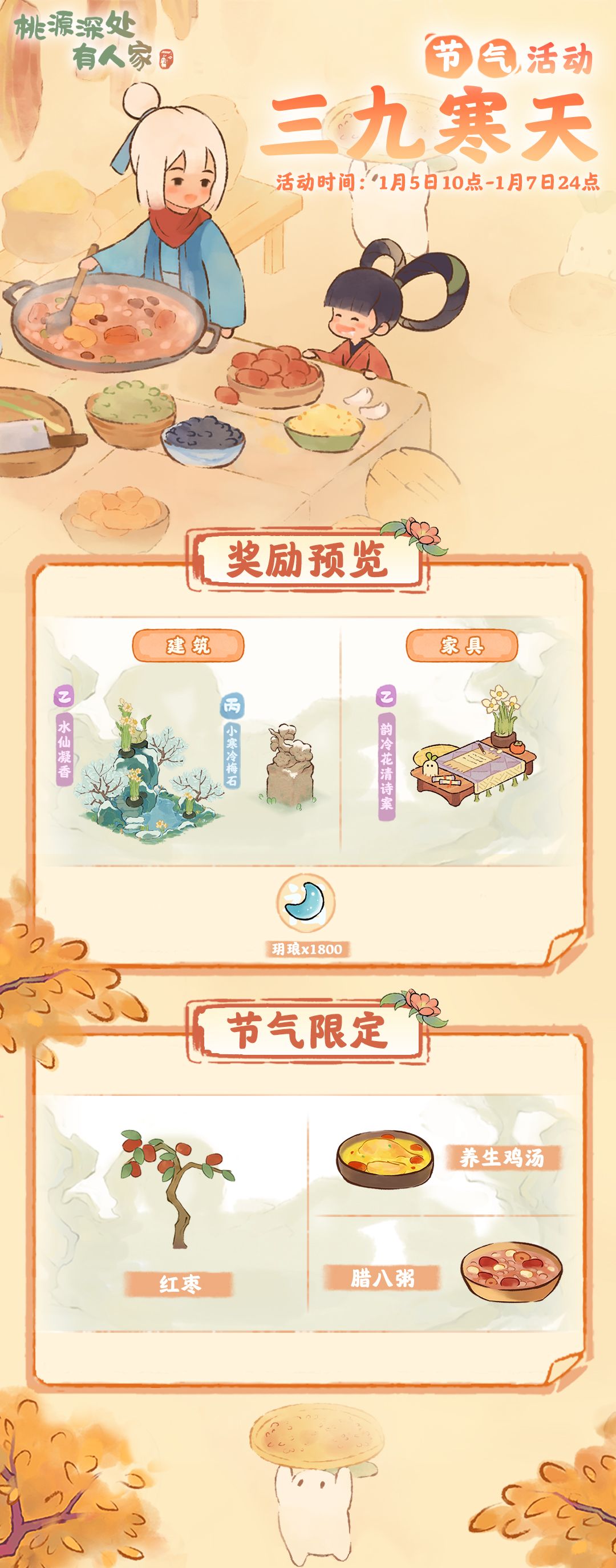 山民在活动期间内,可种植特殊农作物「红枣」和制作特殊节气菜品「养生鸡汤」「腊八粥」,提交节气订单可以额外获得玥琅。萝萝山已准备好了本期的节气限定建筑和家具,山民记得参与活动获取玥琅,不要错过兑换时间萝~