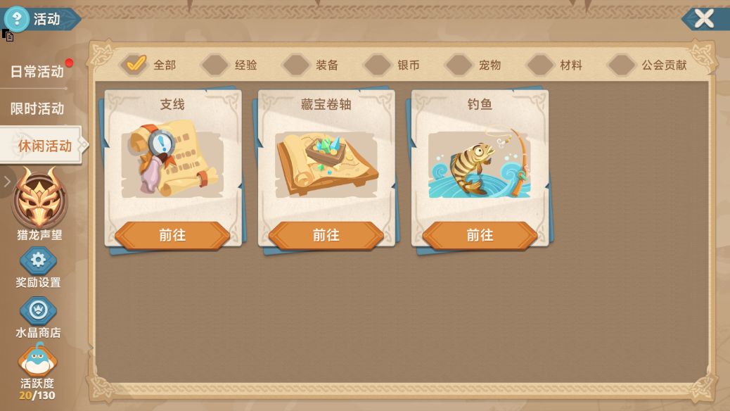 除了日常玩法和限时玩法外,游戏中还提供了休闲玩法,在闲暇之余,我们可以在米德加尔特大陆了解和发掘各种各样的故事,也可以拿着藏宝卷去挖掘宝物,还可以预上几个好友去渔区垂钓