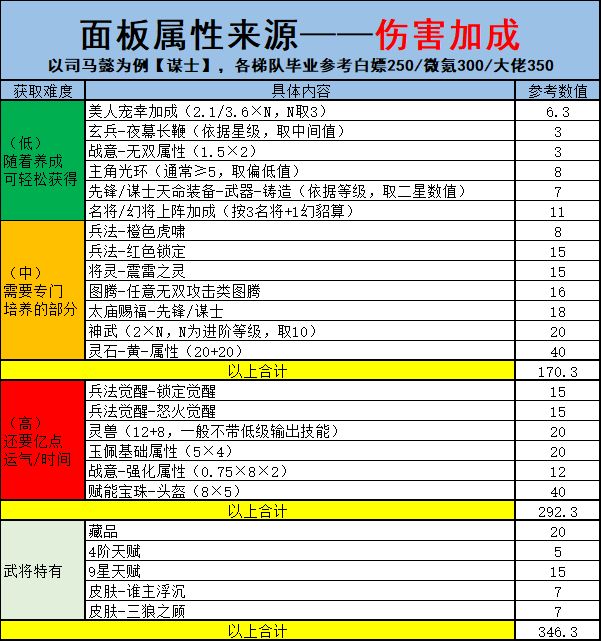 涵盖各种阵容武将的核心属性,方便大家分析自己哪部分的培养还有欠缺,查漏补缺,进而在后续培养上补足。