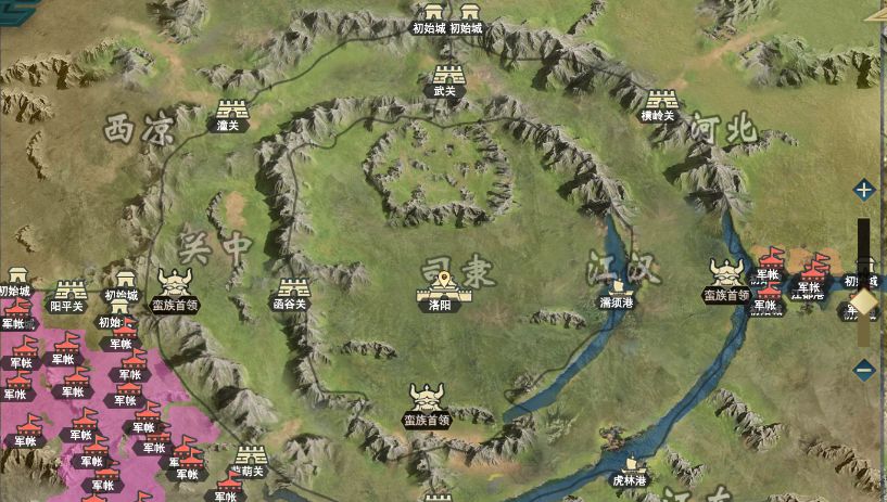 每座城池有自己的区域范围,每座城池和城池之间相邻,由城池地界线分割。玩家需要通过占领相邻城池的方式,逐步推进路线,最后完成攻占洛阳的任务。