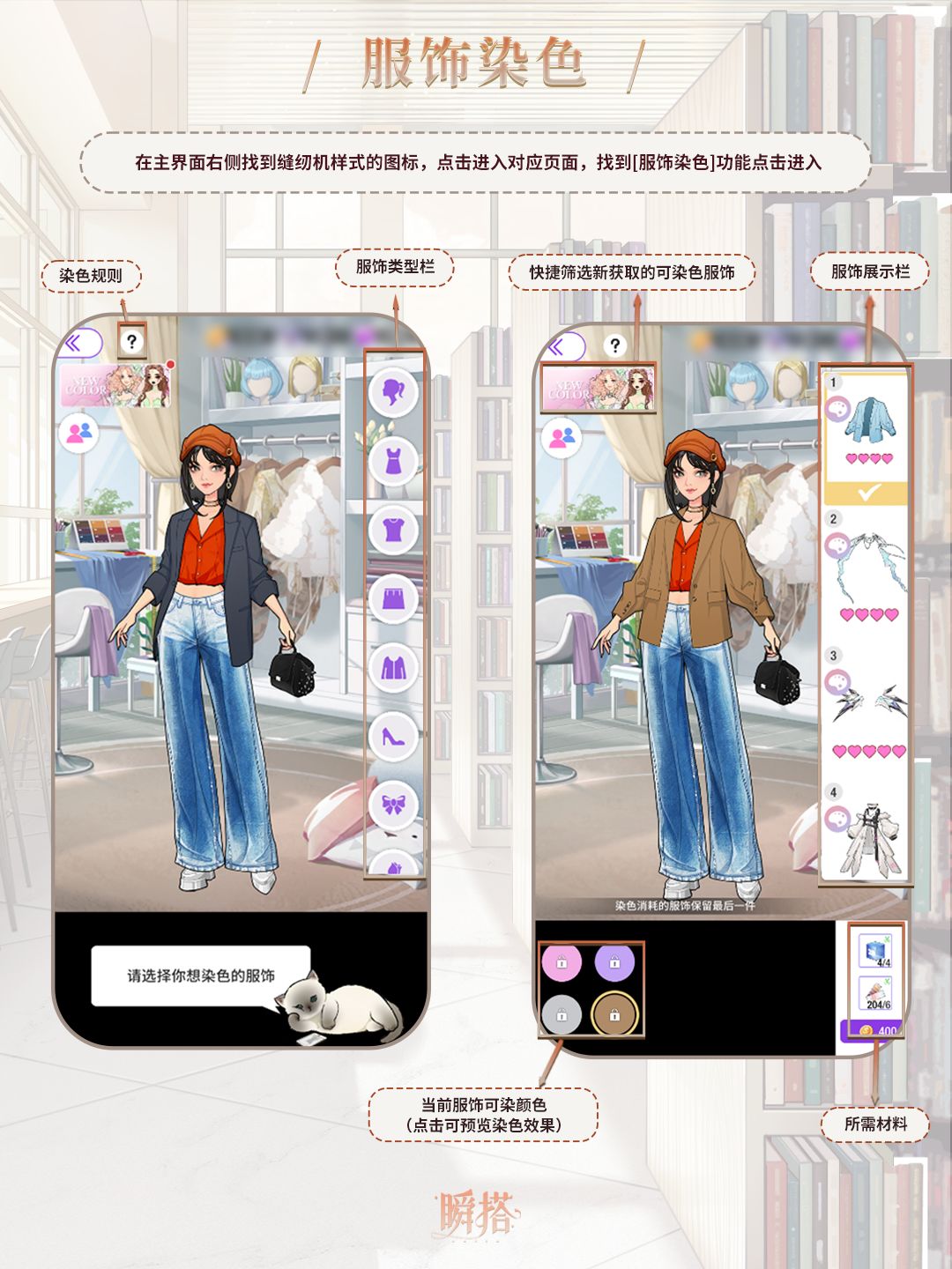 在《瞬搭》的染色玩法中成为一名“色彩魔法师”,用不同色彩为你的服装注入新的活力。