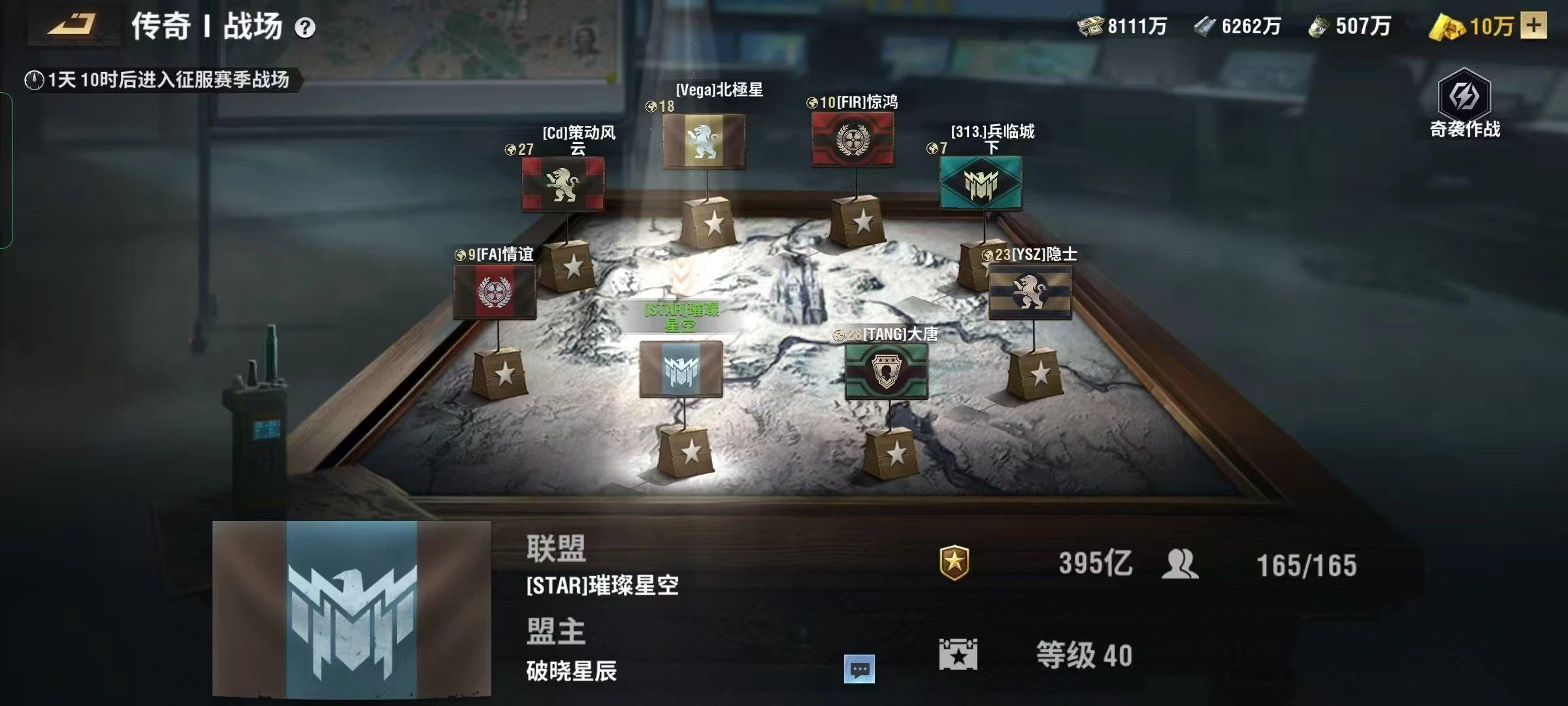 本次征服赛季传奇Ⅰ战场结盟情况为:6区【璀璨星空】、10区【惊鸿】、18区【北极星】、28区【大唐】 VS 7区【兵临城下】、9区【情谊】、23区【隐士族】、27【策动风云】。