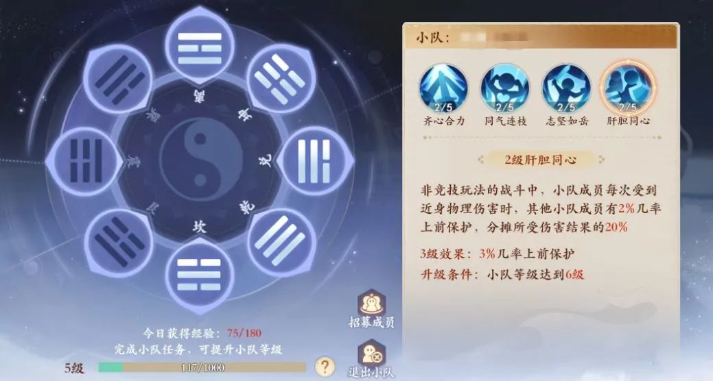 肝胆同心:非竞技玩法战斗中,所在队伍拥有小队成员≥2时,成员每次受到近身物理攻击,其他成员有几率上前保护,分担伤害结果