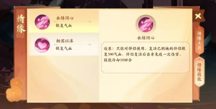 相濡以沫:只能对伴侣使用,同时回复自己和伴侣的气血,恢复效果为等级*10,冷却10回合。(回复的少,且冷却久一般用的比较少)