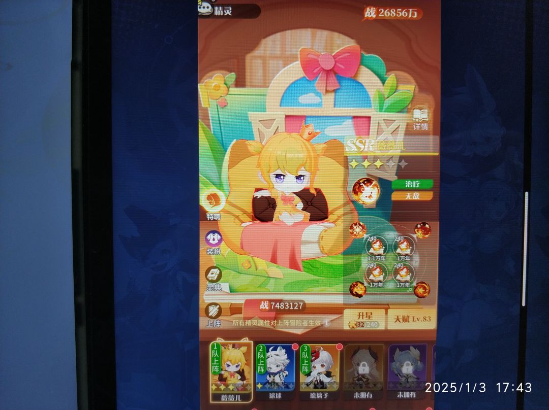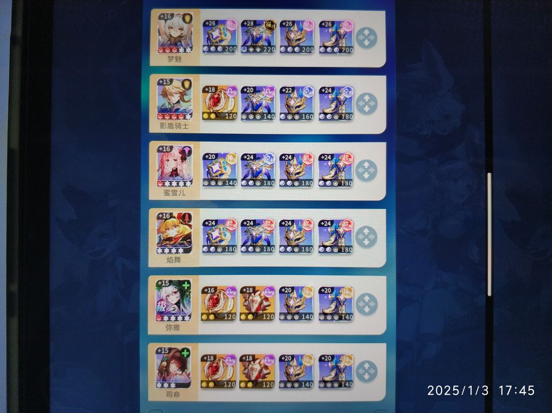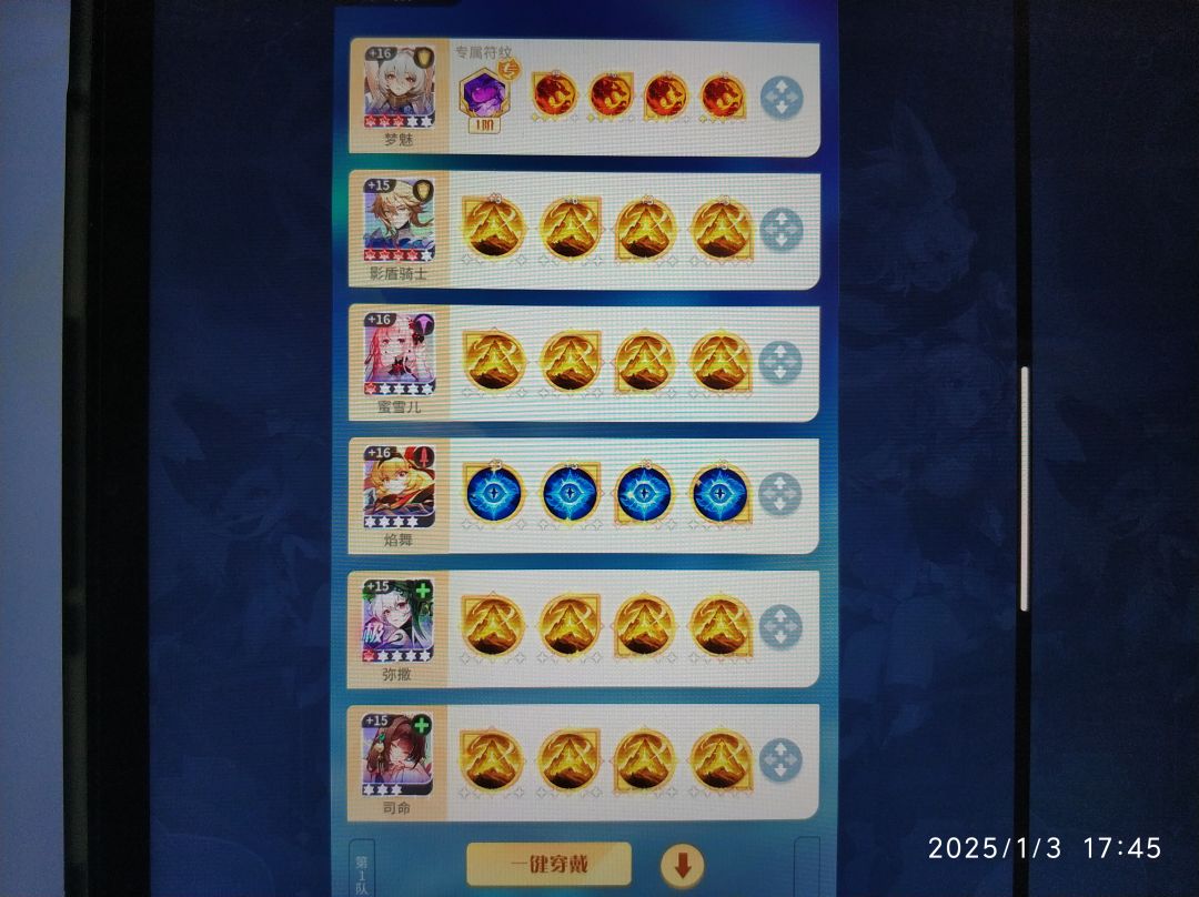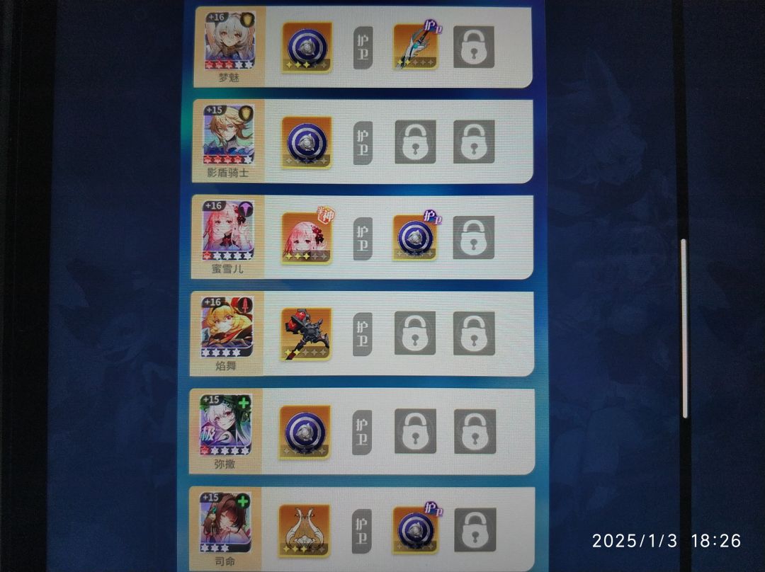 和我攻略一样,除了主c以外全用免伤,大多没有升级,梦寐符文突破9666三星开了8精良,专属是复刻活动白嫖的。