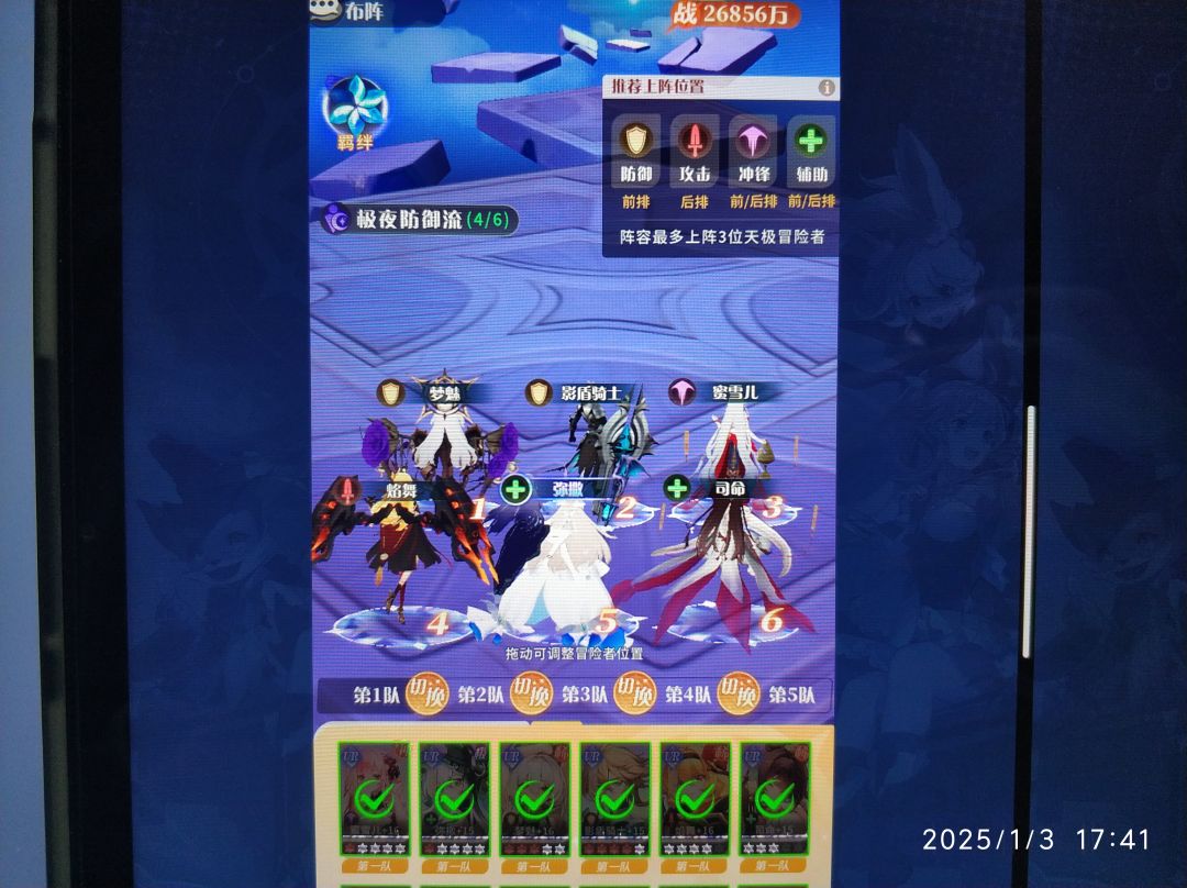 装备要注意,一套极限装备给主c单挑,一套次顶级24给副c,两套24防给坦克和蜜雪,蜜雪算是焰舞的辅助吧,两套20防给辅助。