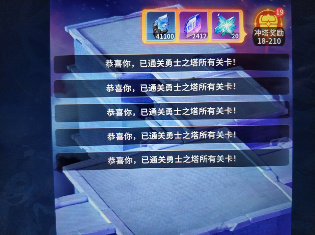 自创阵容2.68亿战力通关勇士塔,事先说明,勇士塔NPC每天会降战力,所以开服区通关难度最低,我是开服第三天的区,比开服区难度高两天。我还有开服20多天的号,三亿战力把NPC打到19亿战力了才不到四千层。