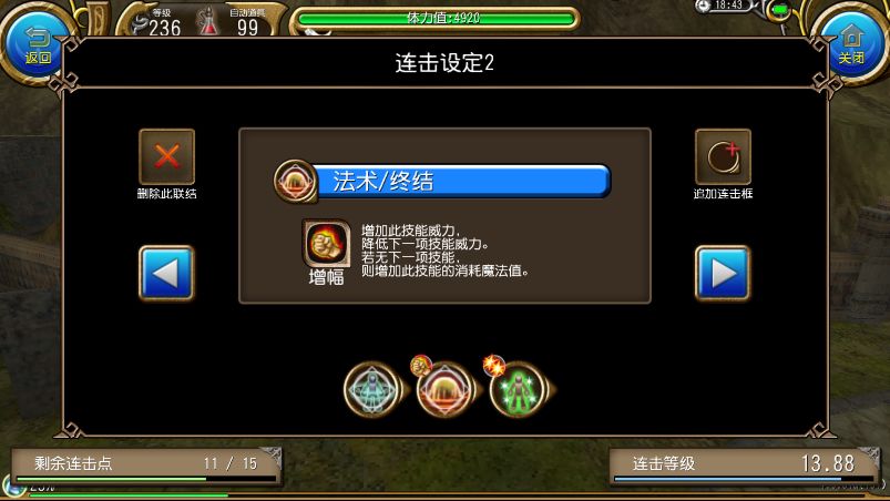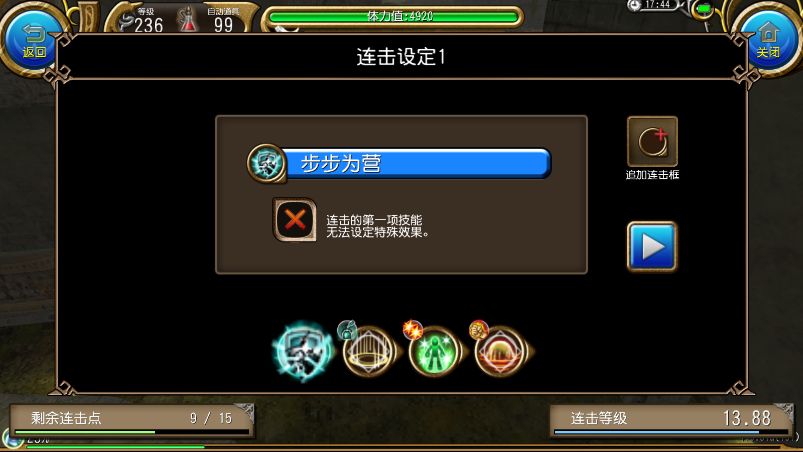 一蓝连击,如果要练连击等级,把后面冲击波终结去掉,在主城按顺序点前面四个技能即可,刷怪的时候需要加上