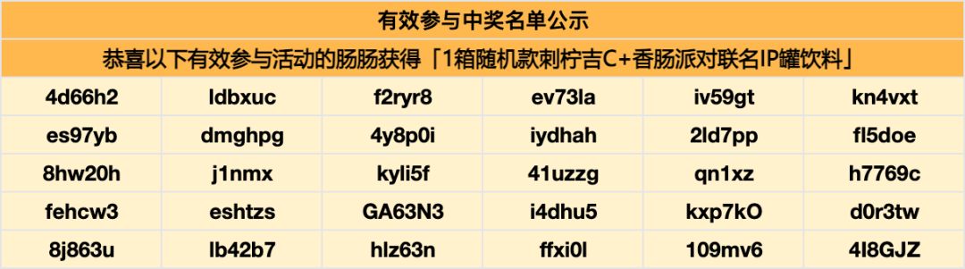 4、【1箱随机款刺柠吉C+香肠派对联名IP罐饮料】为实物奖励(活动奖励包含12瓶饮料,不包含礼品卡),请中奖肠肠及时查看邮件并与发奖小助手沟通~