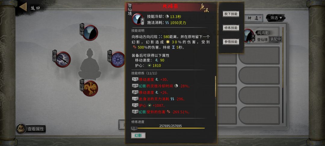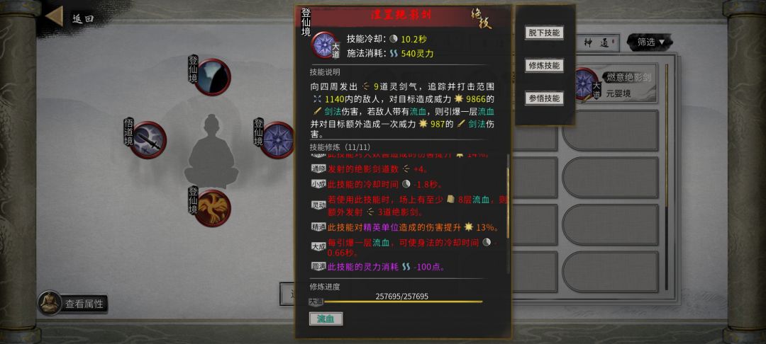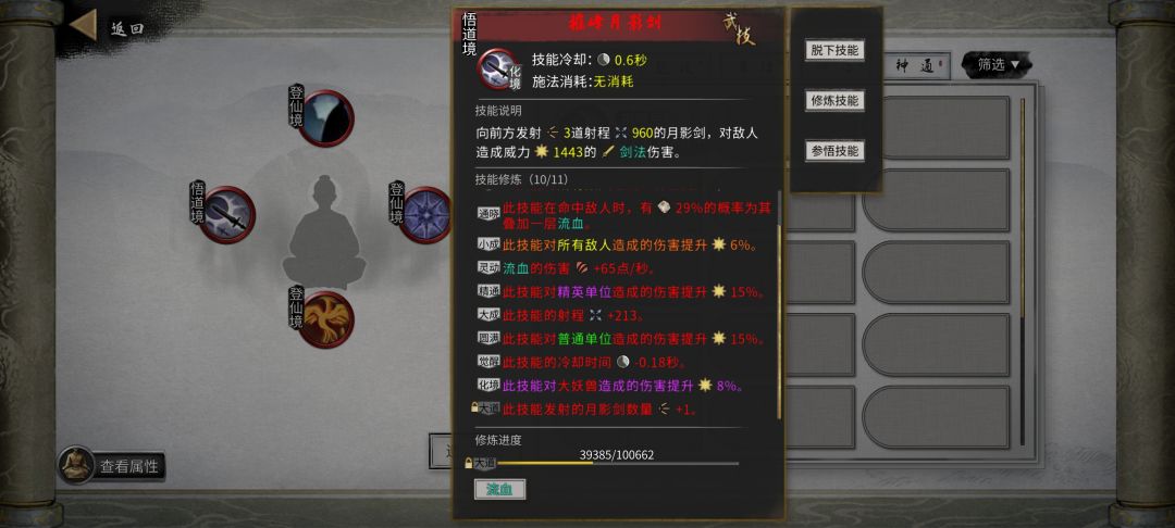 前面几个境界都是新手任务一样,真正开始卡游戏进度是具灵,元婴之前的功法太难凑cd词条,无法做到技能爆流血减身法cd,从而叠增伤。在具灵我花了很多时间升技能学技能,到了元婴境基本上火剑流有个初步的成型了。