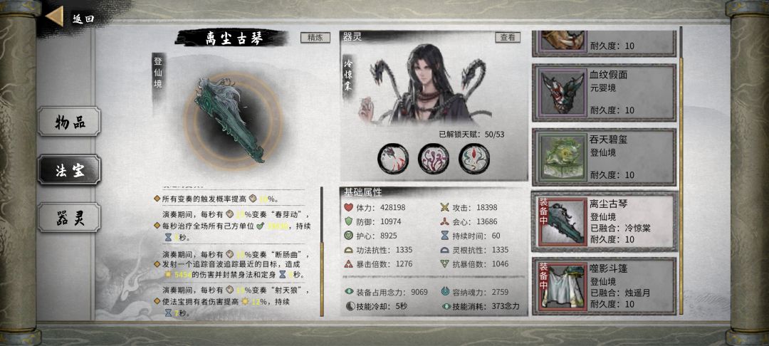 法宝器灵技能选了回血词条,因为这个档没出血魔吸血。