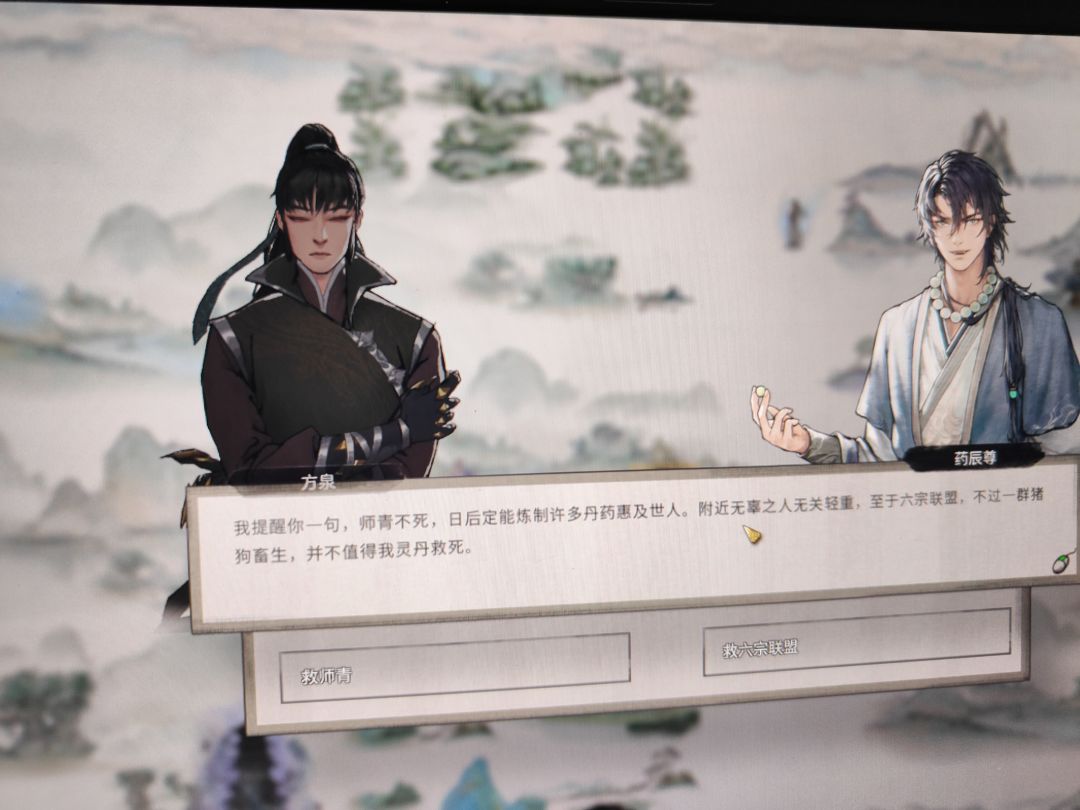 骂完药辰尊,道友找师青汇合但是回去之后师青已经被药辰尊抓走了。师青徒弟邀请一个月之后攻打神鼎观,这里重要选项是“救师青”还是“救六大门派”