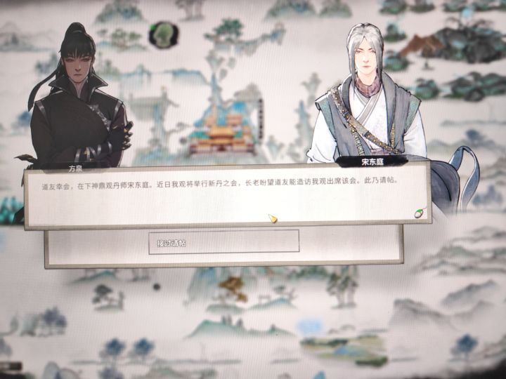 离开云房会遇到两方人打架,你会遇到师青,看到你来她会选择撤离紧接着就是药辰尊他们。会给你一个“丹方辑录”在背包里面,点击使用会有一段线索,再次点击会学会三个丹方。学习之后会收到一封请帖,开启第二阶段。