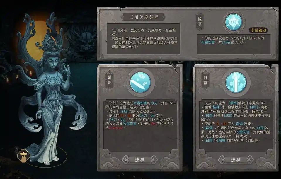 刺骨:飞剑变为冰刃,吃冰伤属性,有15%几率暴击变为2倍伤害,计算公式为飞剑攻击*(1+冰伤属性百分比)。