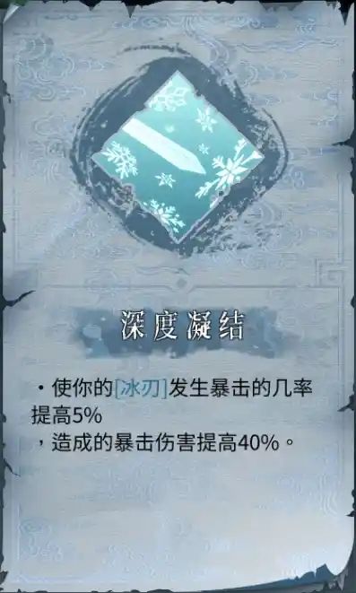 【深度凝结】:使冰刃暴击概率提高5%,暴击伤害提高40%。计算公式为飞剑攻击*1.4*(1+冰伤属性百分比)。