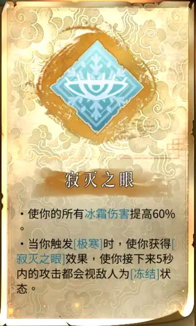 【寂灭之眼】:使你的冰霜伤害提高60%。(不体现在面板上,最终伤害=冰伤*1.6)