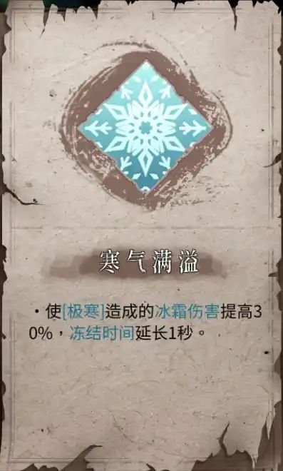 【寒气满溢】:使极寒造成的伤害提高30%,直接叠加计算,计算公式为1.5*近战攻击*(1+冰伤属性百分比)。