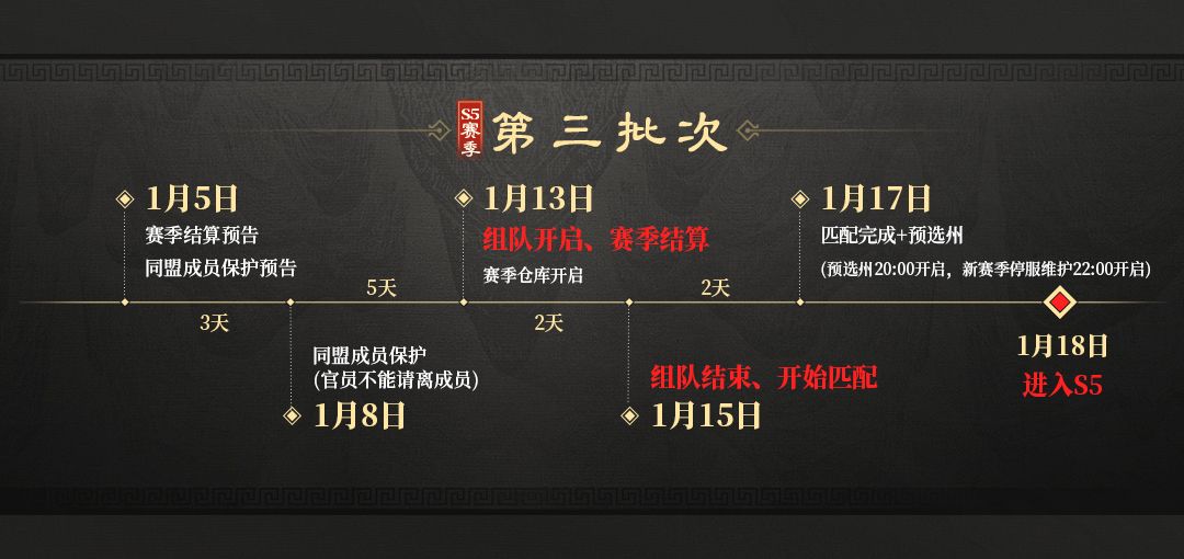 1月5日0点S5问鼎赛季「应天受命」第三批次服务器开启赛季结算和同盟成员保护预告。