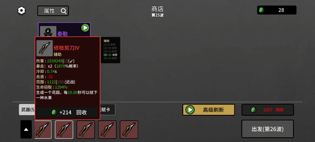 2.前几波结束后,升级优先选[收获],可以刷新选,商店买[掌],有+收获的道具也买,减护甲啥的都不要怕,只要加收获就买。