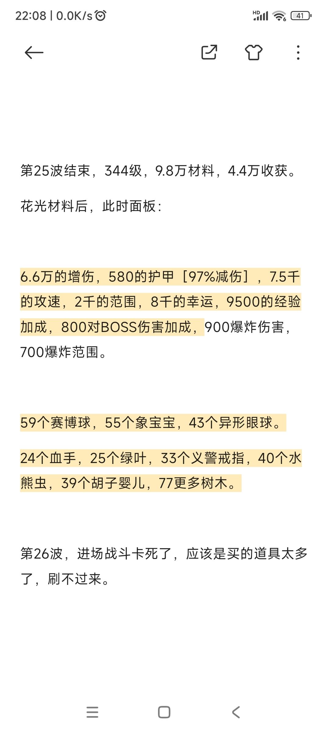 7.如果有刷到储钱罐的话,第15波左右囤的材料应该不少了,可以适当花一些增强过图能力,保证过图没问题。如果没刷到储钱罐,材料不用屯,全用了,增强实力与[收获]。