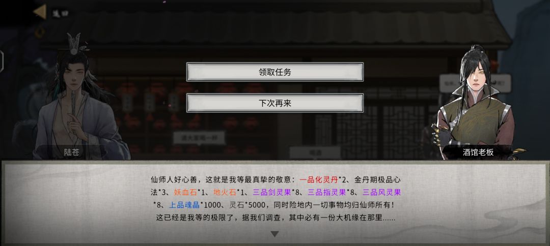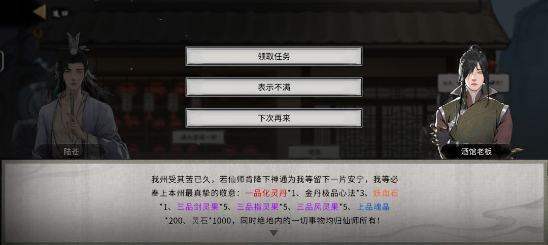 2,酒馆里有委托,这个委托每个镇都有,跟界元石一样(我开始以为界元石只有城里有),有什么用呢?完成委托会给大量奖励!!!奖励内容有突破材料!!!,按照华封州,一天级,俩地级,俩玄级,一黄级来看,黄级给的是突破结晶的材料,有当康掉的,玄级给的是突破金丹的材料,地级给突破丹和橙色攻法,天级给突破具灵的材料和红色功法,那么不难看出,黄级给的是上一个州突破到下一个州的材料,玄级给的是本州从下境界突破到上境界的材料,地级给突破丹和橙色功法,天级给突破到一个州的材料和红色功法。突破材料一次给的量大概是1/3,玄级会大量给重复的。注意天级有三个对话框一定要先点第二个让他加价!!!另外,我完成玄级委托后接到了符纸相关的任务,符纸原来从这里弄!!!
