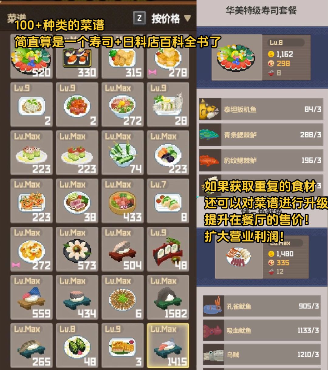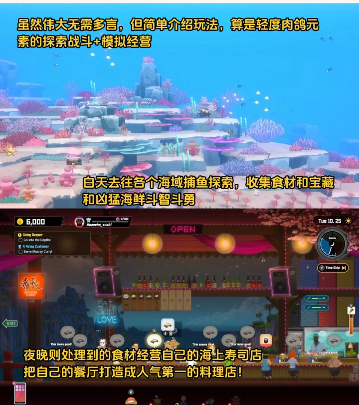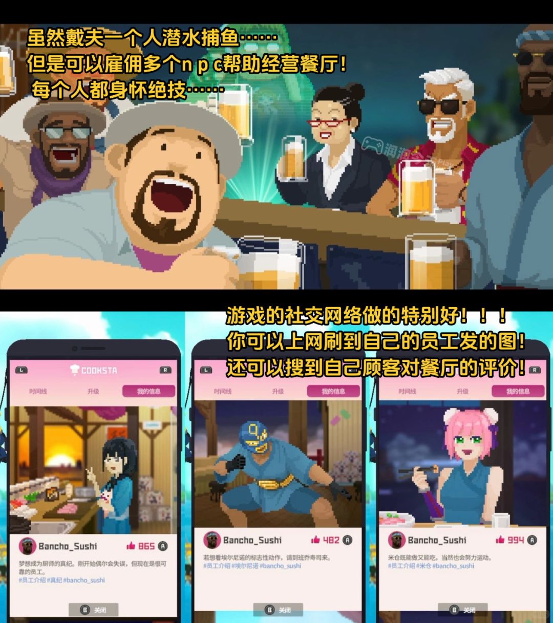 超级丰富的游戏内容让人一不小心就肝到天亮……总结一下:你不仅白天下海捕鱼,晚上还要开店做寿司,培养明星员工,又要懂得经营自己的小鱼场和农田!忙不过来,简直就是忙不过来啊!!!不过没事,这次你可以在被窝里肝个痛快了!!!