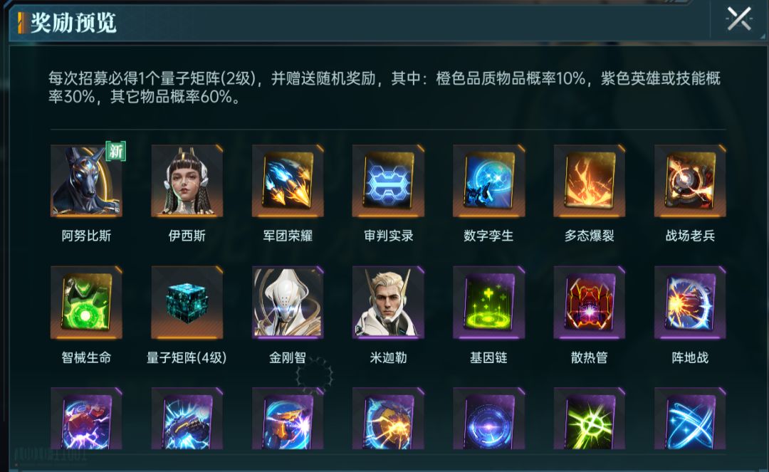 每次招募需要200点信用点,必得1个2级的量子矩阵和随机奖励。随机奖励包含两个S级英雄和两个A级主动英雄,还有各种主动技能卡。