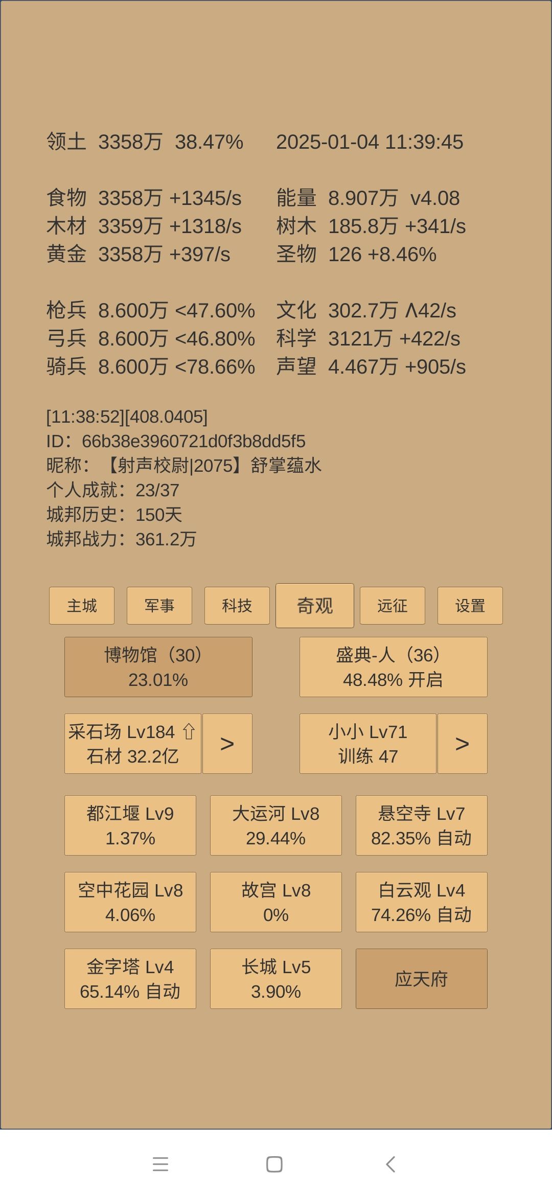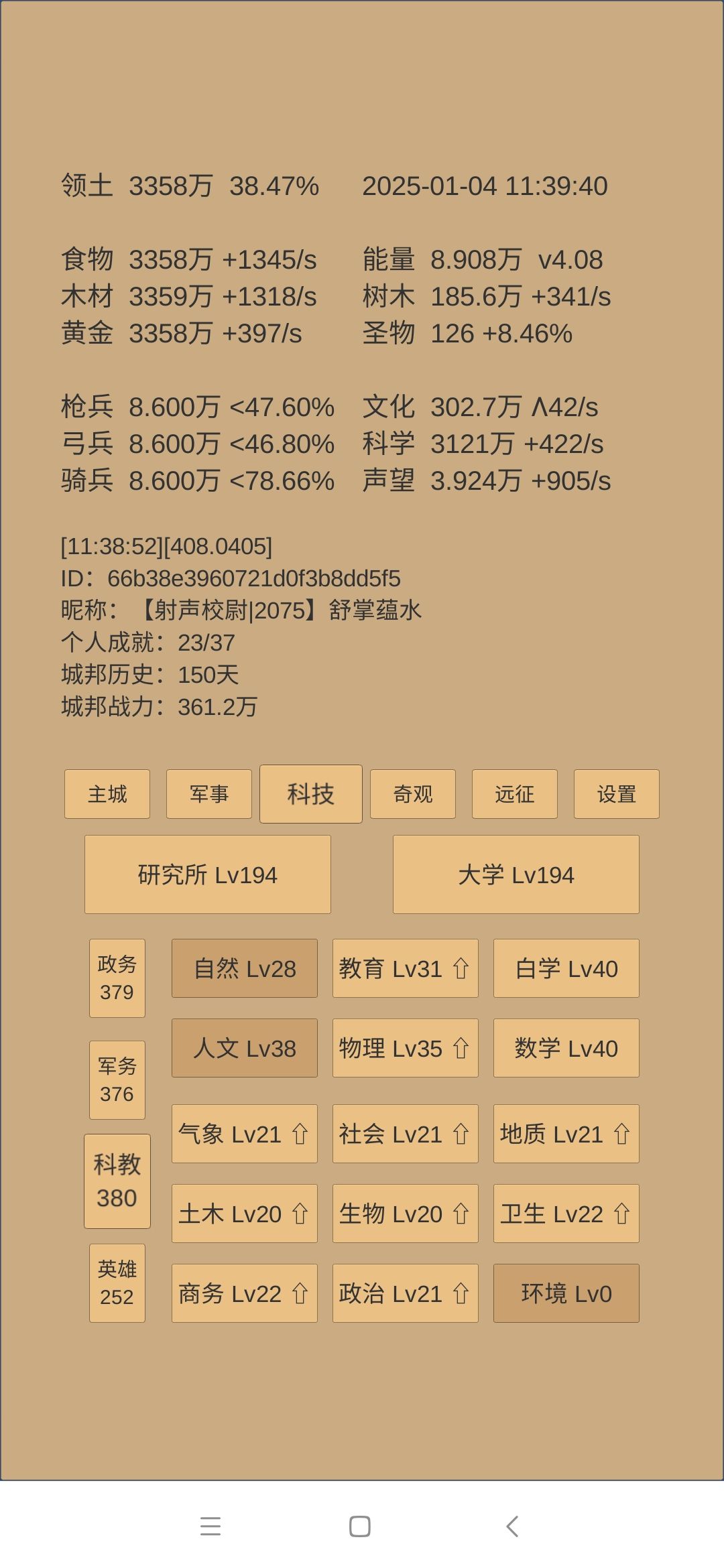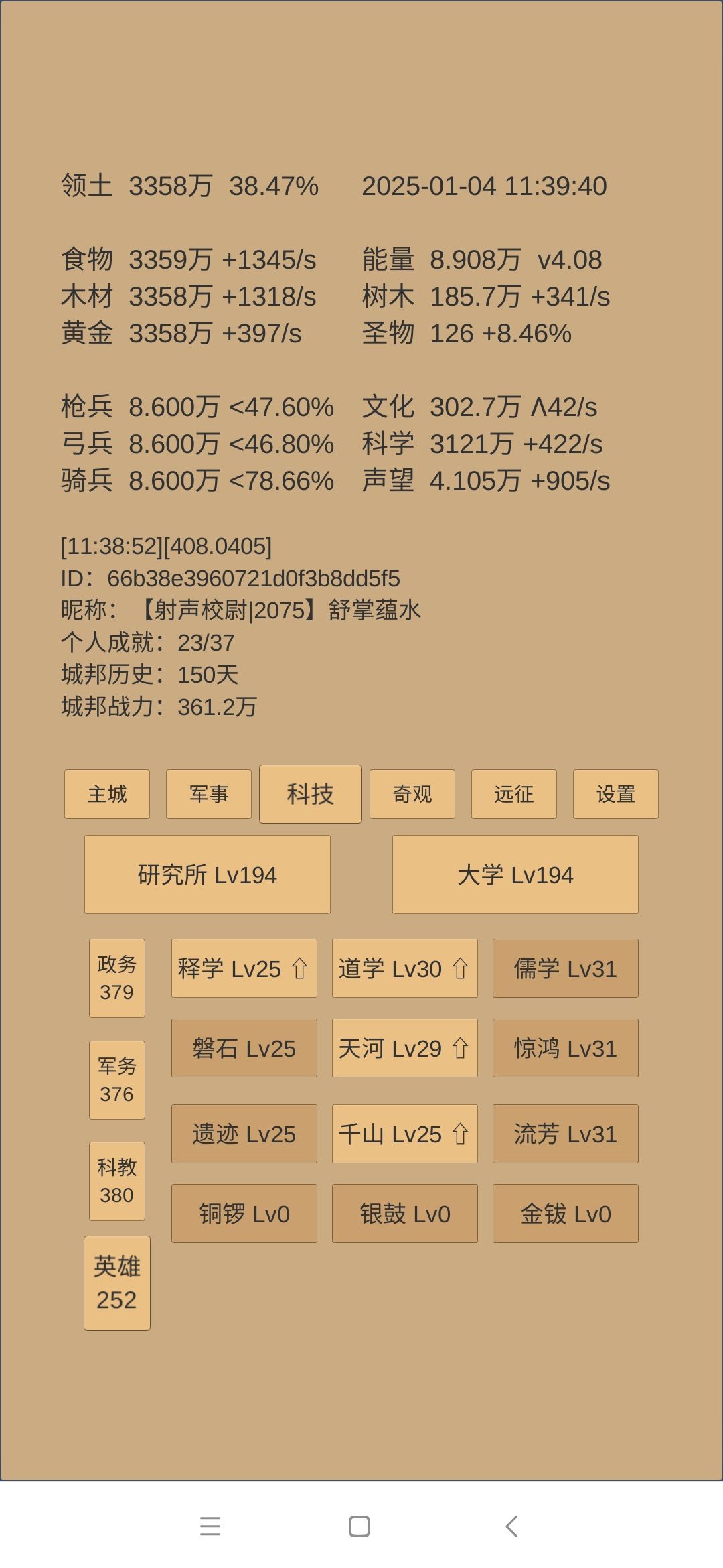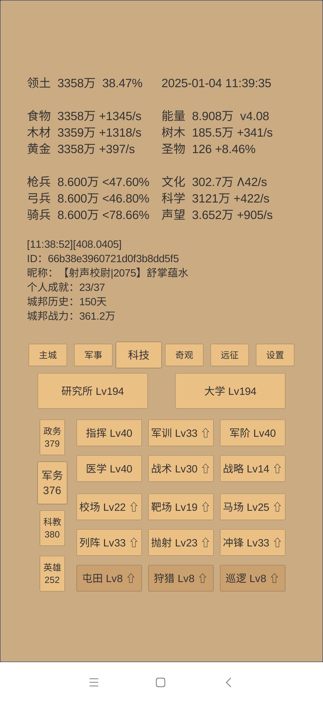下一步思路:科技方面是考古神学和军训点到40级,然后无瑕升级第一时间儒学惊鸿留芳跟一级。如果还有多余科学,升建筑和物理,目的是试图让军营200级开阵图和铜章。